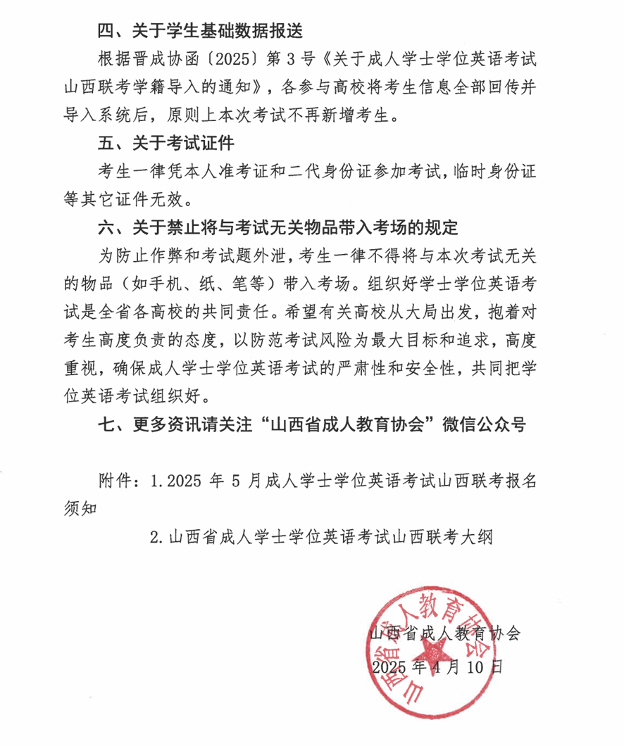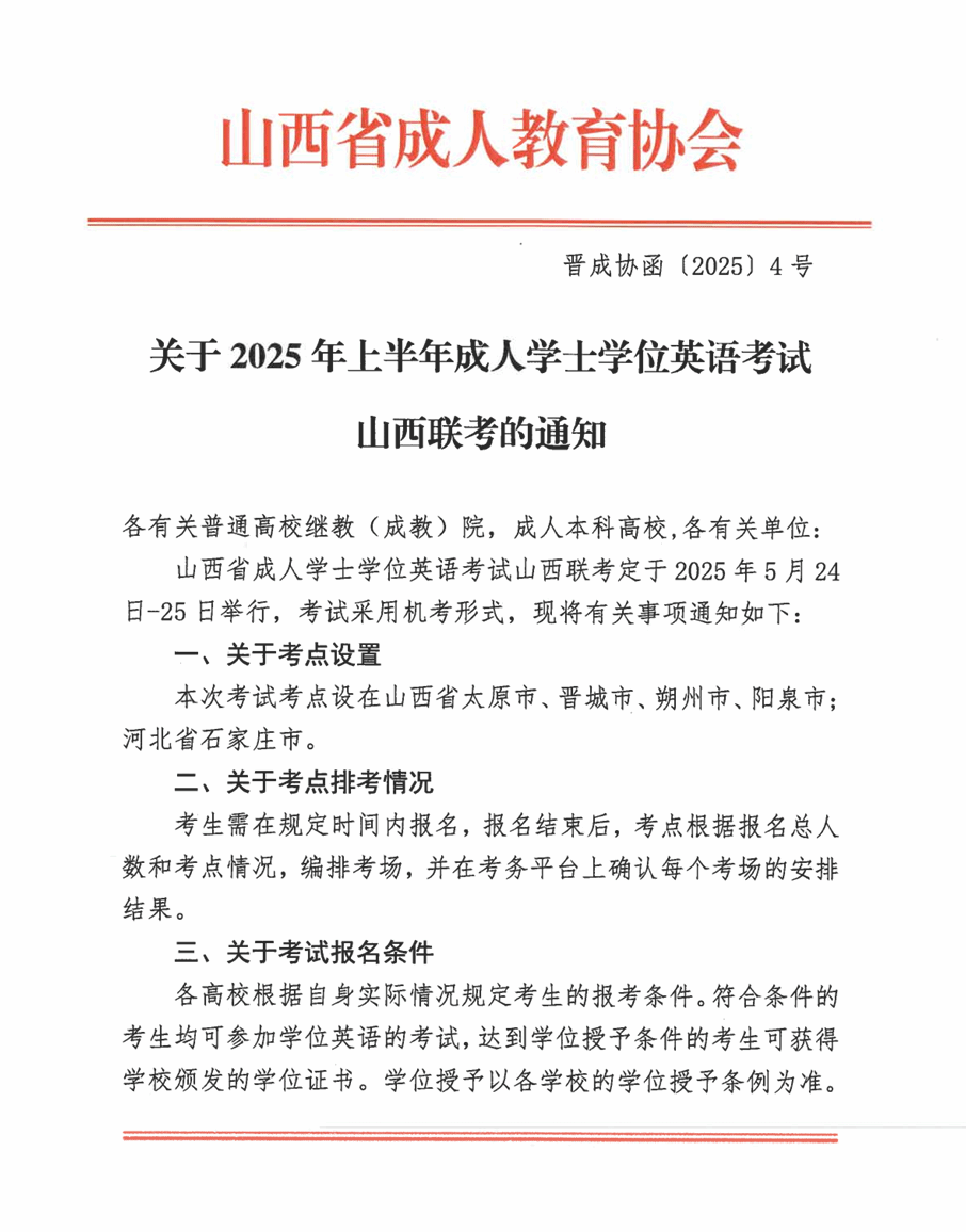 山西省成人学士学位英语考试山西联考将于2025年5月进行,现将有关事项通知如下: